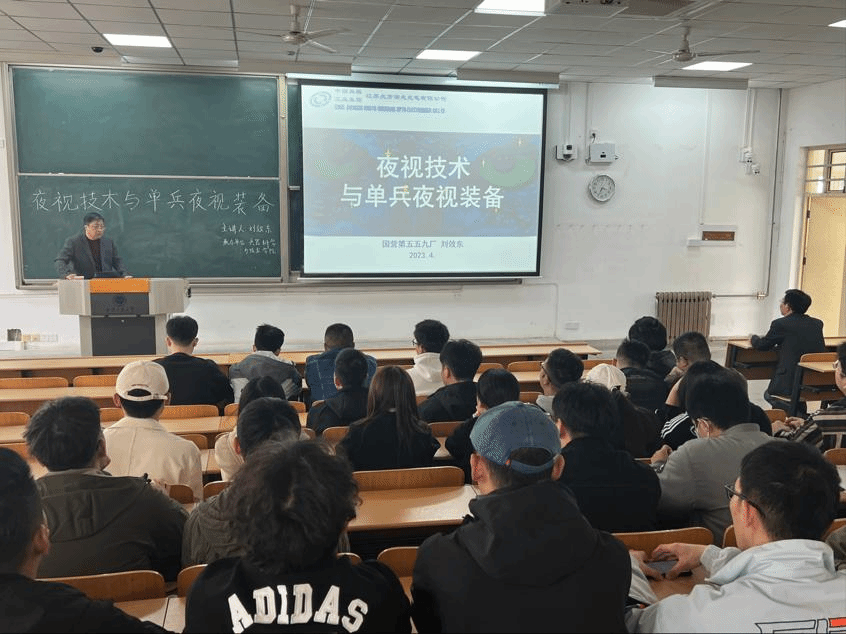 刘效东研高工结合国营五五九厂的生产科研情况为师生详细介绍了夜视技术、主动式红外技术、微光像增强技术、红外热成像技术和图像融合技术等,系统地分析了夜视技术未来的发展趋势和应用前景。最后,与会师生体验了国营五五九厂研发的融合望远镜,并与刘老师进行了深入的互动交流。